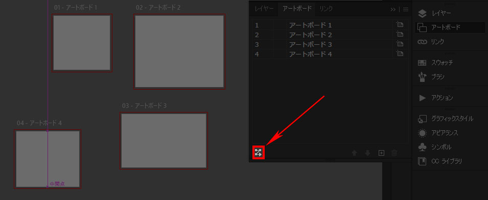 これがアートボードの「再配列」ボタンです。今後はここからアートボードを再配列させましょう。