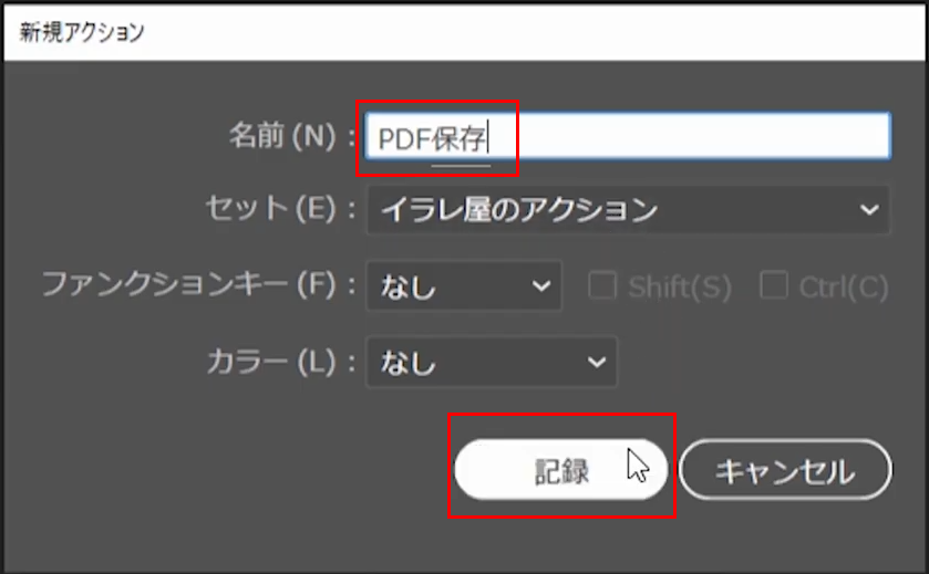 新規アクションに名前をつけて「記録」ボタンを押すとアクションの記録がスタートします。