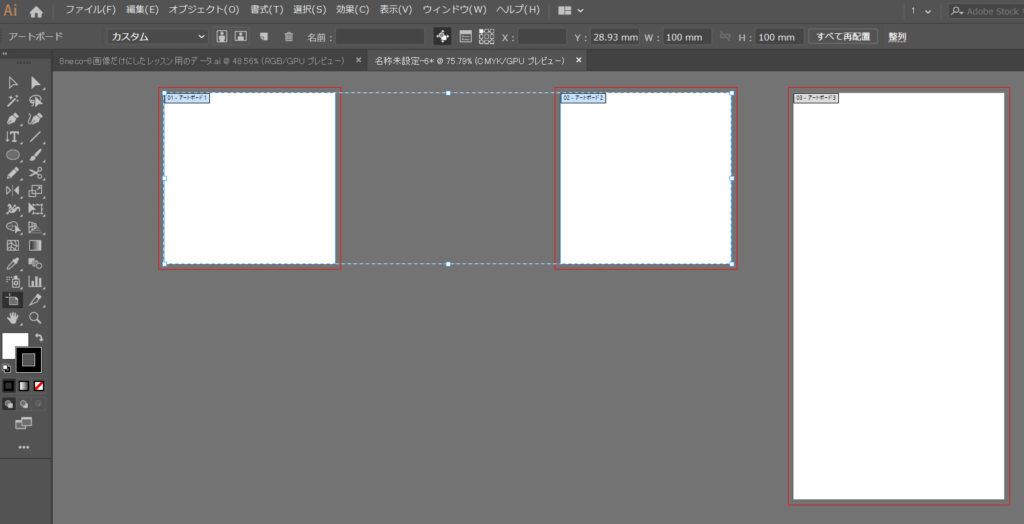 一括でアートボードが整列できました。これが、イラレのアートボードを複数まとめてサイズ変更しキレイに順番通りに再配置する方法です。