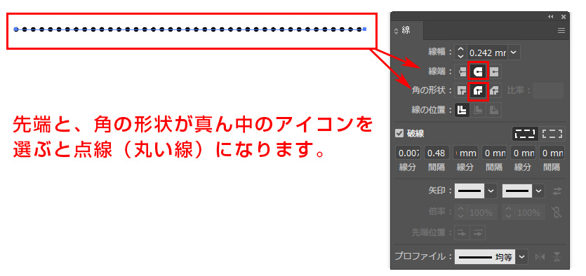 Illustratorで作成した点線を四角形にする設定方法のやり方です。