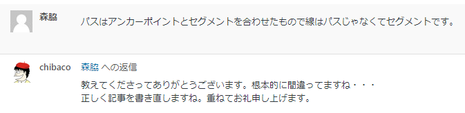 このように森脇様からご指摘いただいて、セグメント(線)のことを「パス」と書いていた、こちらの記事を直しました。スマートガイドで線部分が「パス」と表示されるので、線のことを「パス」と思ってたのですが正しくは線の名称は「セグメント」です。
