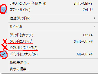グリットにスナップ機能と、ピクセルにスナップ機能はオフにします。ここが重要なポイントです。