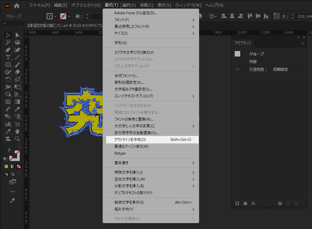 続けて、メニューバーの 「書式」>「アウトラインを作成」 を実行します。これで文字がパスに変換され、フォント環境に依存しないデータになります。